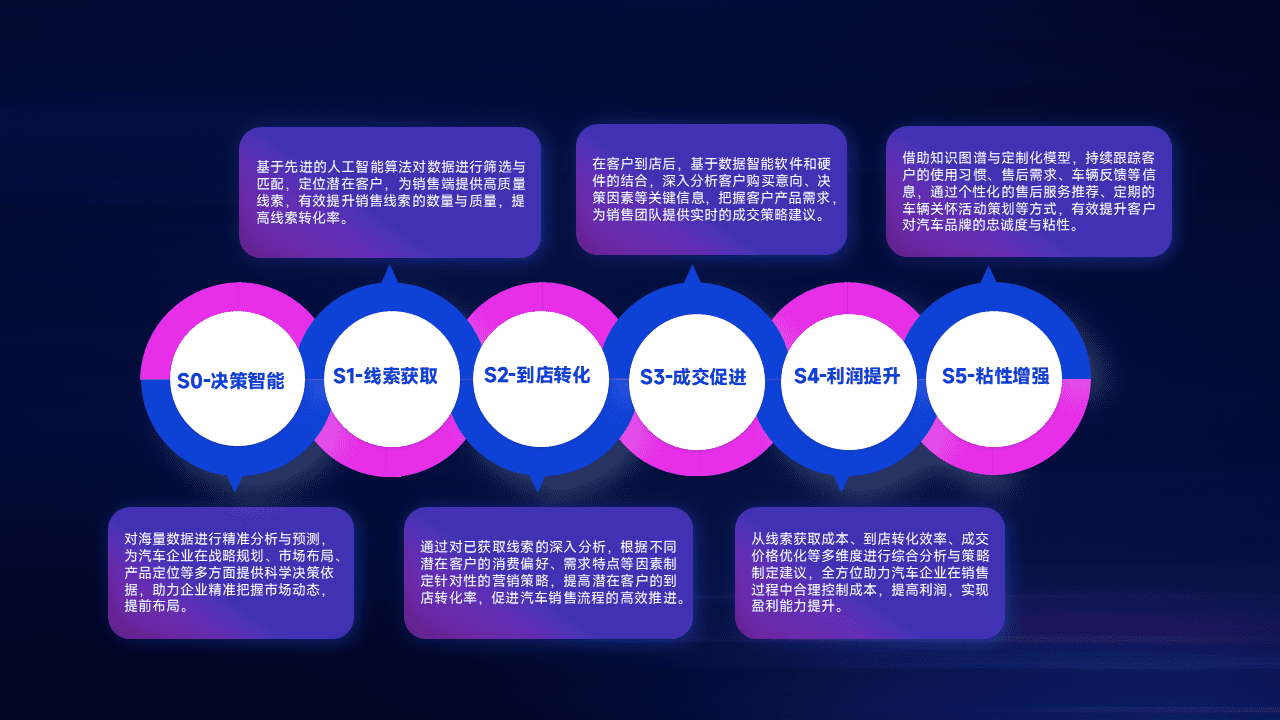 基于销售转化漏斗的薄弱环节,,为客户提供数据+模型+运营的智能应用,,实现销售业绩的提升;推动线索管理全链路的精细化管理和运营。。